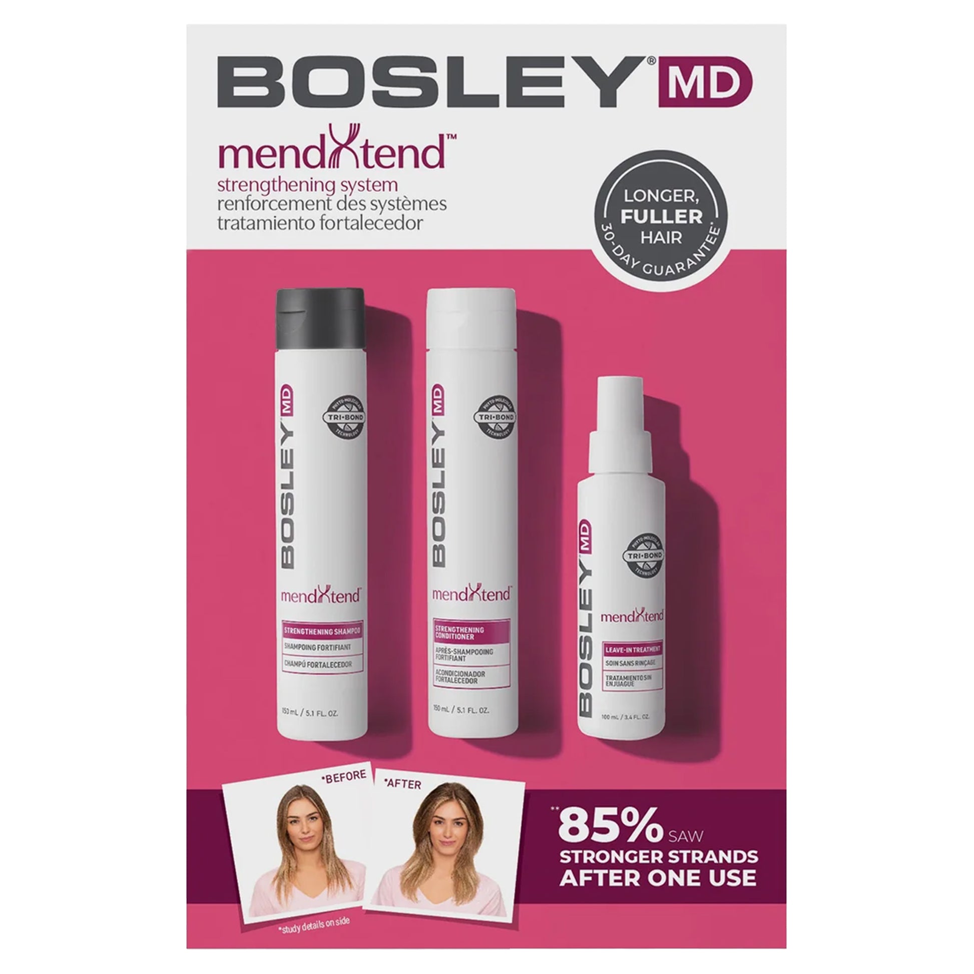 Achieve longer, thicker, and fuller hair with the BosleyMD mendXtend Strengthening System Trio. This system, which includes Strengthening Shampoo [5.1 oz], Conditioner [5.1 oz], and Leave-In Treatment [3.4 oz], is designed to promote healthy hair growth and strengthen strands from the innermost layer of hair. With the Tri Bond phyto-molecular technology and DHT inhibitors, this system helps to improve the overall health and appearance of your hair. Say goodbye to thin and weak hair and hello to a more voluminous and resilient mane with the BosleyMD mendXtend Strengthening System Trio.